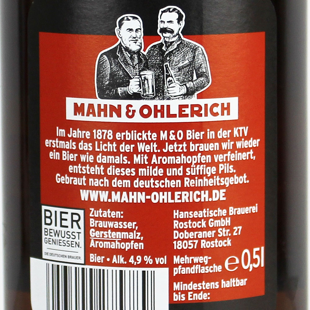 "M&O - Mahn und Ohlerich, ein Bier aus der Hanseatischen Brauerei Rostock GmbH, ist ein Produkt, das auf Tradition setzt. Das Bier wird in Rostock hergestellt und ist ein helles Blondes mit einem Alkoholgehalt von 4,9% Vol. Es hat eine leichte Note von Zitrus und Honig und ist süffig, malzig mit einer Note von frischem Heu. Die Hanseatische Brauerei Rostock GmbH hat eine lange Tradition in der Bierherstellung und ist bekannt für ihre hochwertigen Produkte. Entdecken Sie die Tradition von