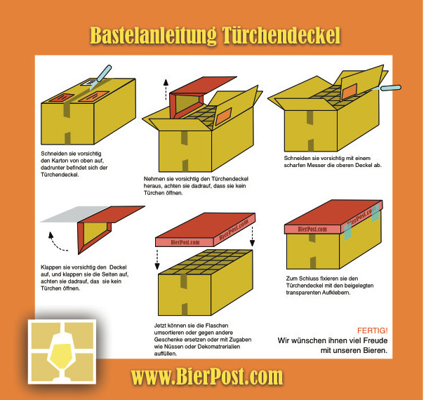 Damit Sie den hochwertigen Bier-Adventskalender nutzen können, muss dieser im ersten Schritt aufgebaut werden. Hierfür nehmen Sie den Karton, in welchem die verschiedenen Bierflaschen an Sie versandt wurden. Dieser beinhaltet neben den einzelnen Flaschen auch einen besonders dekorativen Adventsdeckel, den Sie ganz einfach auseinanderfalten und anschließend am Karton selbst befestigen können. Schon ist der äußerst raffinierter Bier-Adventskalender fertig.