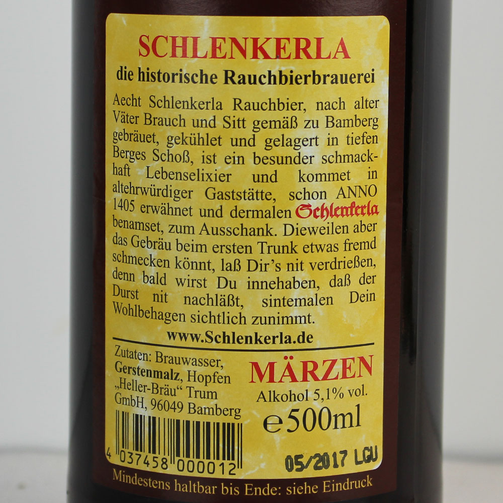 Mit einer Stammwürze von 13,5 % ist das süffige Aecht Schlenkerla Rauchbier besonders aromatisch und einfach lecker. Es hat einen Alkoholgehalt von 5,1 % Volumen und wurde ursprünglich in Bamberg gebraut und abgefüllt. Ein wirklich hervorragendes Rauchbier, das geschmacklich absolut überzeugt. Das Aecht Schlenkerla kann zusammen mit einer deftigen Speise ebenso gut getrunken werden wie für sich allein. Aber auch ein Stück Käse, gutes Brot und Schinken passen optimal zu diesem raffiniert würzigen Bier.